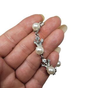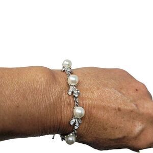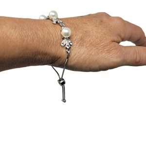 Charter Club Dainty Bolo Slide Bracelet Silver Tone Faux Pearl Rhinestone Adjustable