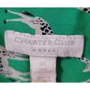 The Charter Club Women's Button Up Top in size 3X features a fun giraffe animal print, perfect for a casual or workwear occasion. This collared shirt with long sleeves and a button closure offers a plus-sized fit for a comfortable and easy-to-wear style. Made from polyester, this multicolor top also includes accents such as buttons and pockets, making it a versatile addition to your summer, fall, or spring wardrobe. Its retro theme and animal print give it a unique and playful look that sets it apart from a basic button-up shirt.
