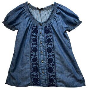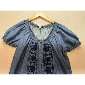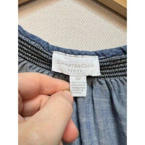 Charter Club Women's Chambray Button Up Shirt Embroidery Size 10P Blue Smocked