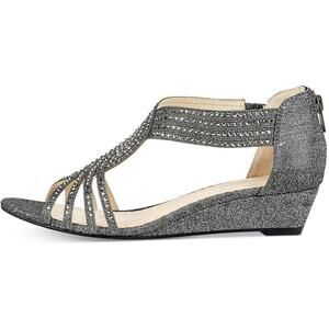 Elevate your ensemble with the Charter Club Women's Ginifur Wedge Strappy Dress Sandals, a sophisticated choice for any formal occasion. Shimmering in a pewter silver hue, these sandals pair a sleek, strappy design with a comfortable wedge heel, standing 3 to 3.9 inches tall. The synthetic upper material and lining offer a breathable fit, while the padded insole and straps ensure a comfortable wear throughout the day. Crafted for the stylish woman, these sandals are perfect for transitioning from spring to fall. The solid pattern and metal theme exude elegance, and the buckle closure secures a snug fit in a size 5M. Whether you're attending a summer soiree or a fall festival, these sandals will carry you with grace and poise.