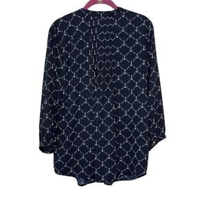 This Charter Club blouse is designed for women and comes in a regular size small. It features a blue animal print with a V-neck and 3/4 sleeves. Made from polyester, it includes a button front and pleated design. The blouse is machine washable and manufactured in Indonesia. The item is pre-owned.