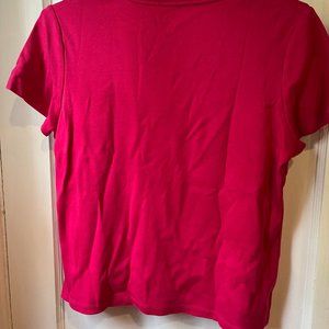 Charter Club raspberry red women's knit basic tee. Fabric is heavier that a regular tee-shirt -- very good quality. No spots or stains, round neck and short sleeves. Length of shirt 22", width pit-to-pit is also 22".