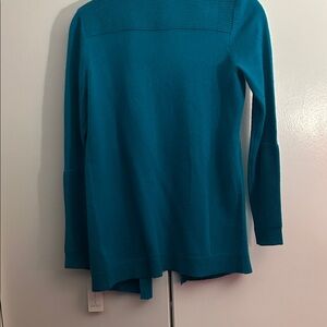 Elegant teal cardigan with open front. Features ribbed detailing and front pockets. Ideal for layering. Dark teal color.