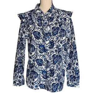 Charter Club X-Small Top Floral Long Sleeve Button-Up Ruffled Collar Blue White