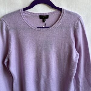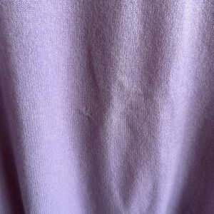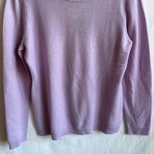 Charter Club lilac cashmere sweater, size M. New with tags; small repaired area in front (shown) that is not real obvious but could be hidden by tucking in, belting, or hair banding from behind (last look shown).