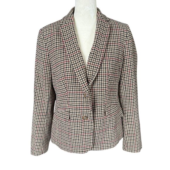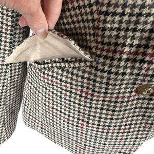 Women's Charter Club long sleeve collared button down fully lined houndstooth wool blazer, size 4. This is multi colored - black, burgundy, cream. Two front buttons as well as button sleeves, two front pockets, and thin shoulder padding. Made in Vietnam. Excellent condition and from a smoke free pet free home. Quick shipper!