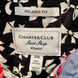 Charter Club Shirt Shop Woman plus size long sleeve button down cotton top, bow pattern, button cuffs, 100% cotton.