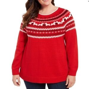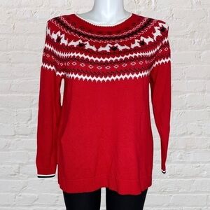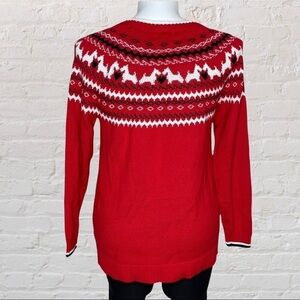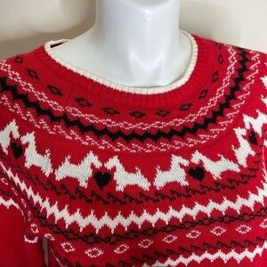 Get cozy and festive with this adorable New With Tags Charter Club sweater! This vibrant red crew neck sweater features a charming Fair Isle pattern across the chest and shoulders, complete with cute white and black Scottie dogs and little hearts. It's the perfect long-sleeve top to add a touch of whimsy and warmth to your wardrobe during the colder months or for holiday gatherings. Made from a comfortable and stretchy cotton-acrylic blend, it feels as good as it looks. From a smoke-free home.