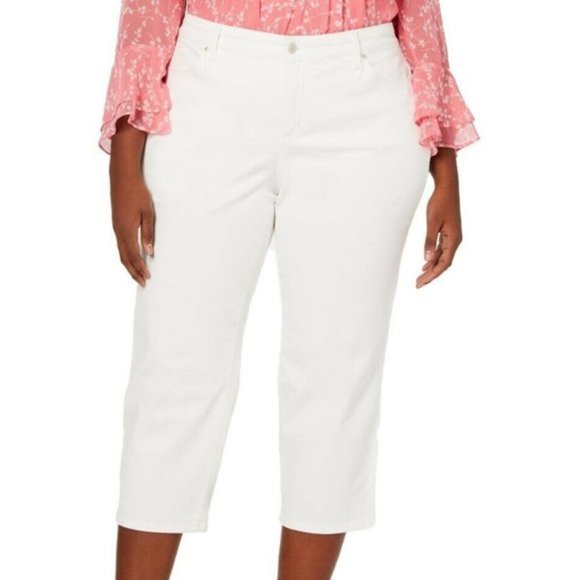 Charter Club women plus size white tummy slimming cropped jeans, sits just below the waist, slim through hips and thighs, super stretch for a superior fit.