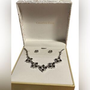 This elegant jewelry set features a stunning silver necklace and matching black stud earrings. Perfect for adding a touch of sophistication to any outfit.