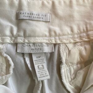 Charter Club White Katherine Fit Capri SZ 10P. Front zipper with belt loops. Band on top is 2”. Two back pockets. Fits with curves. Nice stretch.