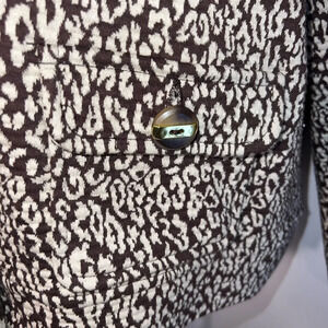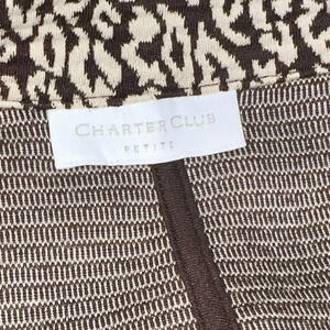 Charter club, Petites, animal print cream and brown long-sleeve button front knit, collared Shacket with flap style pockets material and size tag not found see measurements below.