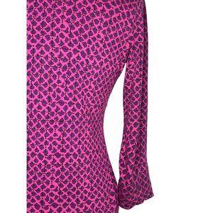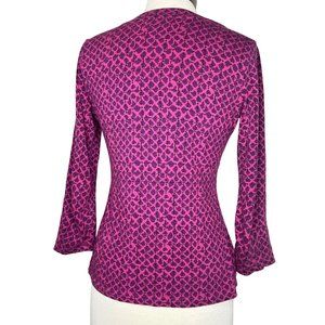 Stylish and vibrant Charter Club women’s top, small size. Features V-neck wrap, gathered chest stretch for comfort. Long sleeves and pink purple Geo print. Made in the Philippines, machine washable, composed of 95% cotton, 5% spandex. Chest 17, length 23, sleeve 19, sleeve from center of back 27.