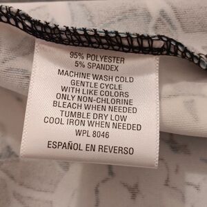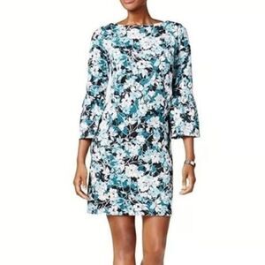 Stylish dress with black and teal leaf design in a soft knit fabric. Shift style, Juliette sleeves. Back zip. Size PM measures 38 at chest. The bodice is seamed for fit. 36 at waist,  42 at hips. 37 long from shoulder to hem. So comfortable and great looking,  you'll feel beautiful.