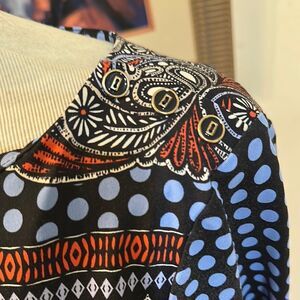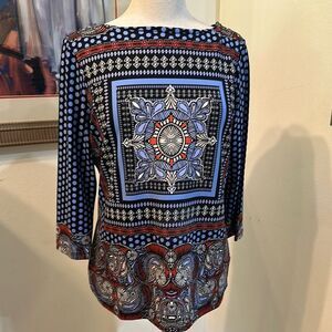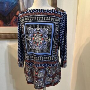 So pretty! This elegant women's top features a striking pattern in black, blue, and red. Perfect for adding a touch of sophistication to your wardrobe. Paired with white pants or capri’s would make a great look. Excellent condition!