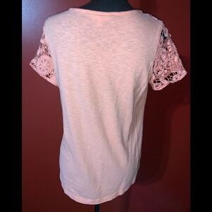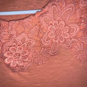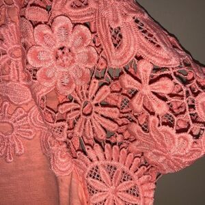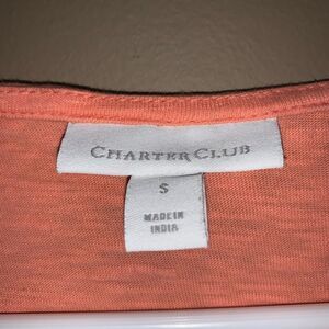 Charter Club's top is styled in cotton with beautifully embroidered flowers at the front yoke and sleeves. Color: coral breeze. Body: 100% cotton. Lace: 100% polyester. Size small. Condition: good- gently used