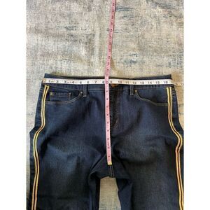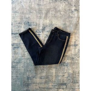 Dark blue skinny ankle jeans with 2 gold stripes down the outside of each leg.