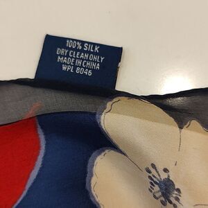 Charter Club Long Floral Silk Scarf. This scarf has various shades of blues, tans and red florals. It has a sheer stripe in between the florals. A pretty piece to complete your outfit. All edges are rolled and sewn. 100% silk.