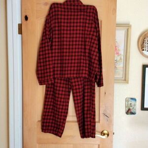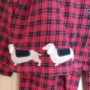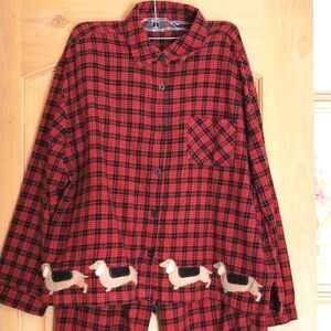 Super cute p.j.s . Soft flannel. Top: Size M measures 48 at chest, 48 at bottom hem. 24 long from shoulder to hem. Sleeves 21. The bottom of the front has a Weiner dog parade of felt puppies stitched onto the fabric. Bottom: 32-40 at waist, 46 at hips, 14 inch rise, 27 long inseam. So comfortable.