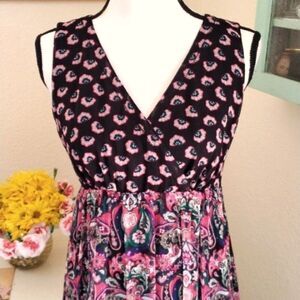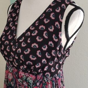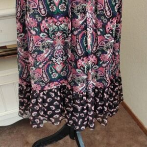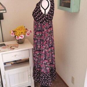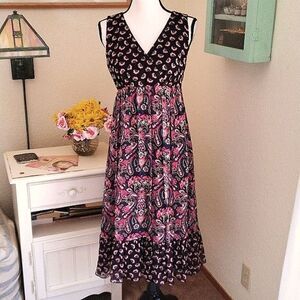 Festival ready or just a beautiful Sunday brunch. Empire waist with a wrap front. Gathers under chest. A deep ruffle at bottom. Fully lined. Size zip. Beautiful semi-sheer contrasting fabrics over black lining. Size 4, showing on my size 5 mannequin, measures 35 at chest, 28 under chest, lining is 38 at hips. 43 long from shoulder to hem. This is a beauty.