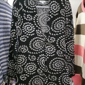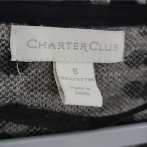 Charter Club long sweater cover-up. Leather snap closure in photos. It's really pretty. Size Small. Material and care instructions in photos. No stains or tares. Non-smoking home. Measurements approximate 29 inches long and 19 inches armpit to armpit.