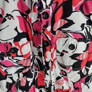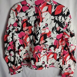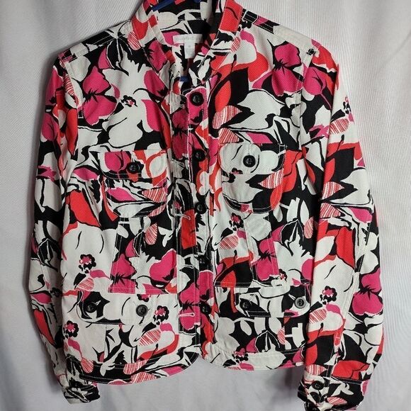 floral, cotton spandex blend jacket, button up, breast pockets, feminine flair on back. chest 20 " length 20". WW