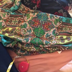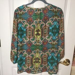 Charter Club (Macy’s brand) women’s blouse in size Petite Large. 3/4 Length sleeve with elastic cuff have a peek through slot. Round neck with keyhole tie. Aqua, greens pink and white beautiful print. Silky feeling polyester fabric. Bust measures 46”, hips 50” with overall length of 26”.