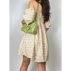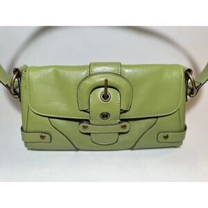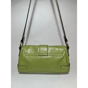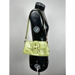 Cute, small chartreuse buckle bag. Bought in vintage mall. No brand name. Lipstick marks on inside lining, but other than that it is in great shape.