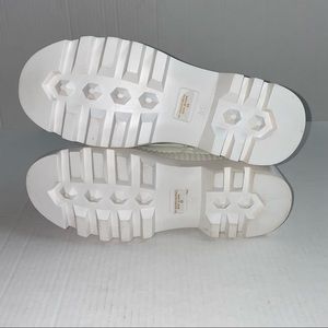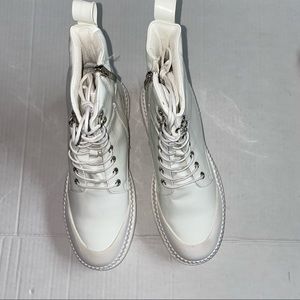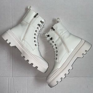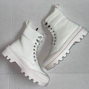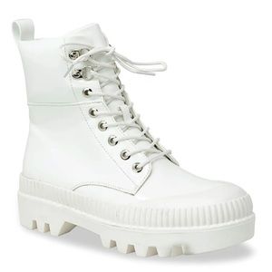 Chase And Chloe Chelsey White Patent Lace Up Combat Boots, NWT/Box, Size 8.5. A shiny patent combat boot features a lugged platform sole for trendy style.