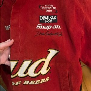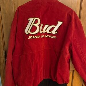 Show off your style with this Vintage Budweiser red racing jacket. Perfect for fans and collectors alike.