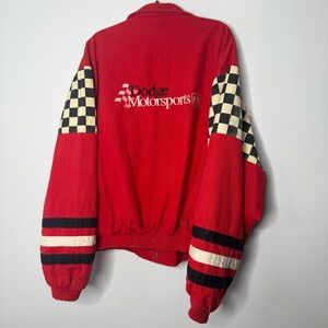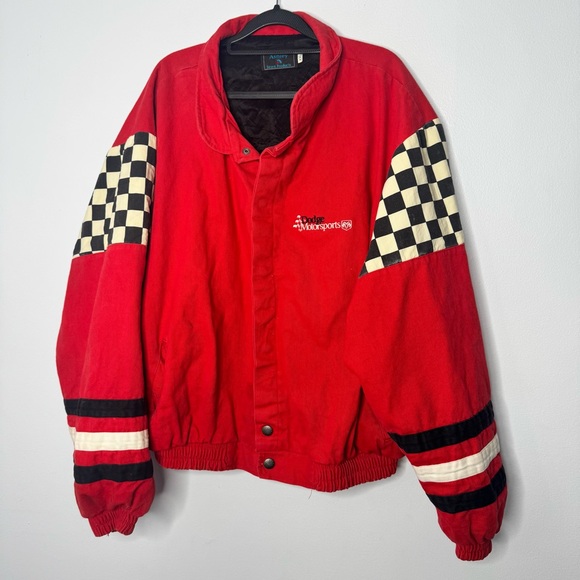 Bold red jacket with checkered sleeves. Features racing-inspired design. Ideal for motorsport enthusiasts.