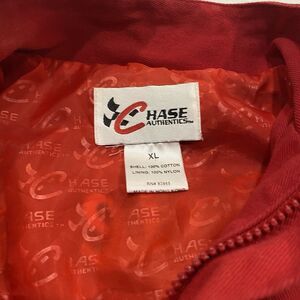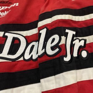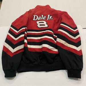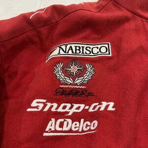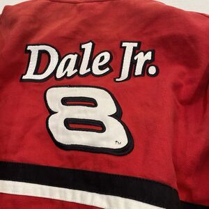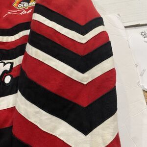 Stylish kids racing jacket. Features bold red and black design. Embroidered logos on front. Perfect for young racing fans.
