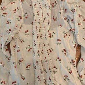 A delicious cherry print sweetens this shapely sweetheart-neck blouse framed by billowed ruffle-trimmed sleeves. Please review all photos before purchasing. I am open to reasonable offers.