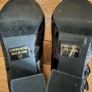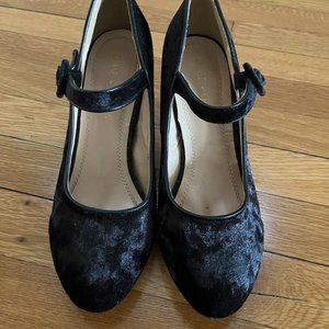 Absolutely adorable and quite comfortable! Black velvet Mary Jane-style heels with round toe, black velvet buckle strap, and 3" block heels.