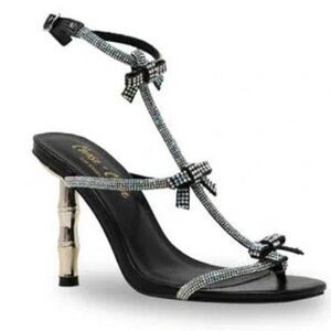 Dainty rhinestones dazzle the slender straps of a special-occasion sandal featuring a bamboo-inspired stiletto heel.