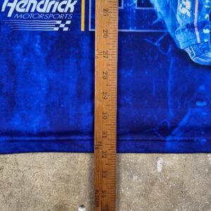 Here’s a Chase Elliott #24 all over print t-shirt from Hendrick Motorsports featuring a bold, full-graphic design showcasing Elliott in his NAPA Auto Parts racing suit alongside his Chevrolet SS. The electric blue lightning backdrop and sponsor logos make this a standout piece of NASCAR fan gear. Dated 2016, it highlights Elliott’s debut season in the iconic #24 car. Made of lightweight 100% polyester with vivid sublimated graphics.