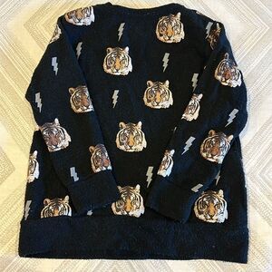 Chaser Black Sweatshirt Tigers and Lightning Bolt All Over Pattern. 13” pit to pit and 16” shoulder to front hem. Size 5. Gently worn but material pils and looks worn.