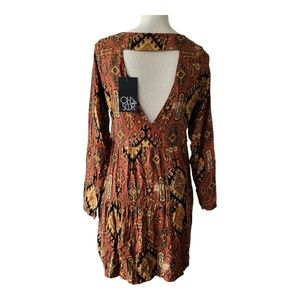 mew with tag. super soft and lightweight. beautiful pattern. super cute open back design. back is longer then front for extra coverage. oversozed style. perfect for spring summer or fall. Stylish bohemian print dress with long sleeves. Features a mix of earthy tones.