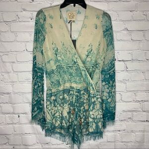 CHASER Boho Blue Silk Chiffon Floral Tapestry Bell Sleeve Fringe Romper