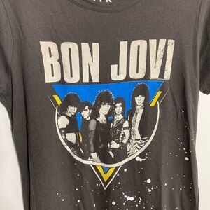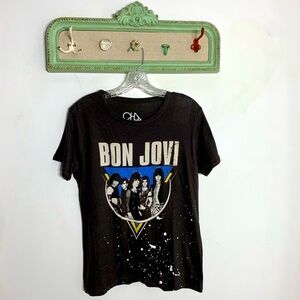 Short sleeve crewneck graphic tee Bon Jovi distressed graphic vintage vibe, soft light weight cotton, paint splattered detail