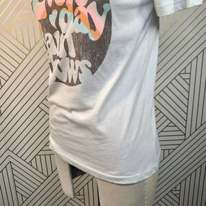 - Vintage 70s-style "Everyday Rainbows" artwork detail this salty white tee
