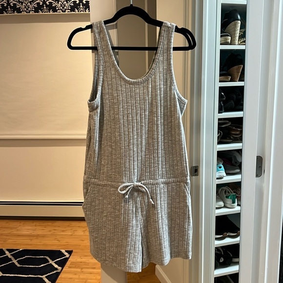 Stylish gray ribbed jumpsuit. Features a drawstring waist. Sleeveless design.