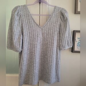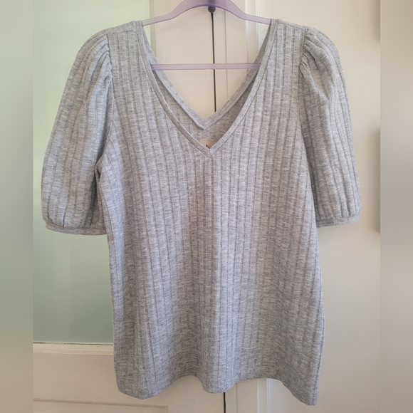 Stylish ribbed top. Features V-neck and capped, softly pleated short sleeves. Perfect for office, dress it up or casual wear.