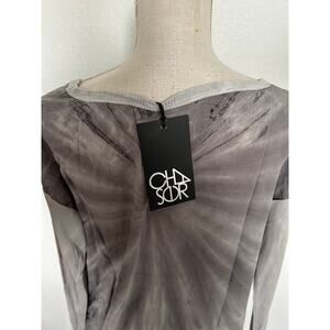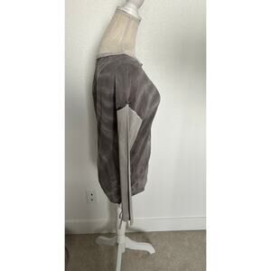 This gorgeous piece will add style to any look. It is a sample piece, it is a gray wash tied dye pattern. It features a boat neckline that is ribbed to match the sleeves. The sleeves are a ribbed cotton sleeve. The sides feature an adjustable lace up detail. As it is a sample piece it does not have a material tag but I was told it is crepe de chine and cotton. It has a lovely flowy feel. New with tags.