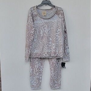 Chaser Linen French Terry Long Sleeve Raw Edge Raglan Pullover White Cheetah Set ( pant and top) Women's Size 1X.
