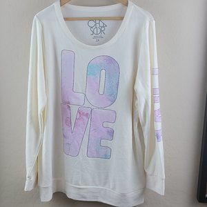 Chaser™ Painted Love Cozy Knit Pullover boasts a round neckline, on a knitted pullover top with the word LOVE throughout. All day comfort ensured!