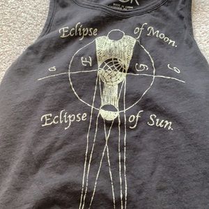 Size small Chaser tank with moon/sun eclipse drawing on front. Close to a faded black in color