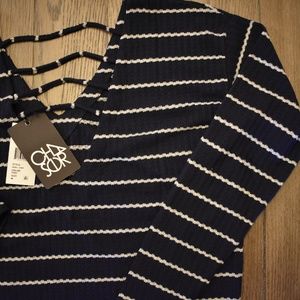 Stripes and a strappy back detailing come together in this v-neck thermal with long sleeves.