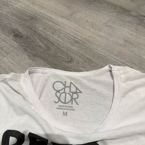 Casual white tee with bold graphic text. Perfect for relaxed outings. Soft and comfortable fabric.