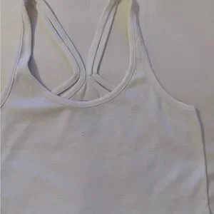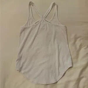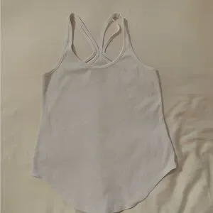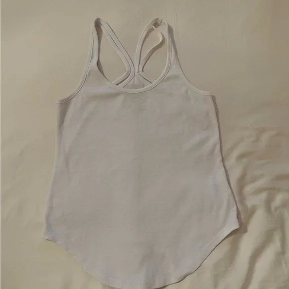 Soft ribbed tank with a scooped hem. Crossed racerback straps for an athletic look. Lightweight knit for easy layering. Neutral white pairs with many outfits.